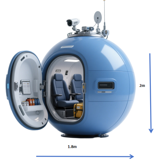 In extreme environments such as polar scientific expeditions and wilderness adventures, it can serve as a mobile survival capsule. The spherical structure has excellent resistance to wind, snow and impact. The monitoring equipment and satellite antenna on the top can realize environmental monitoring and remote communication. The seats and material storage area inside the capsule can provide a safe resting and supply space for explorers, ensuring the survival and operation of personnel in harsh environments.