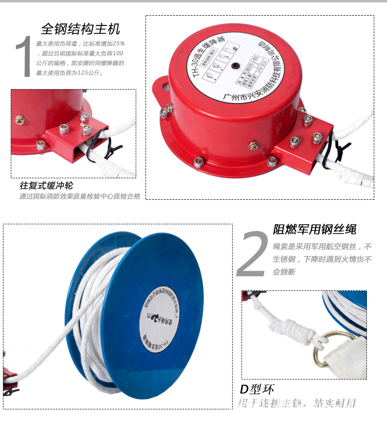 This descender is a reciprocating type of self-rescue and escape equipment for high-rise building fires, which complies with the national standard GA21976.2 - 2012 and has been tested and qualified by the National Fire Equipment Quality Inspection Center.
