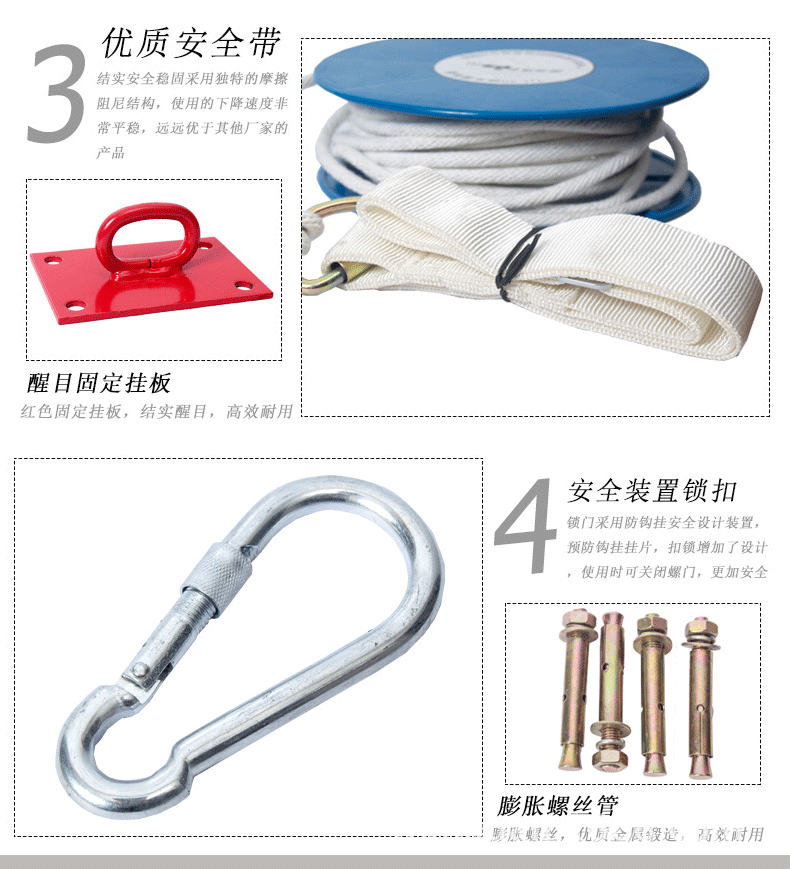 This product is suitable for various places such as office buildings, hotels, entertainment venues, residential buildings, and fire rescue. The product is simple and convenient to use. It can be fixed to the emergency window inside the building or temporarily hung on the fixed objects at the window, platform or roof through the safety hook or auxiliary rope provided for sliding escape. It can also be installed on a high-reach fire truck to rescue trapped people. Users do not need special training and can master the use after carefully reading this manual. In an emergency, both men and women, young and old can use this descender to escape smoothly.Usage instructions