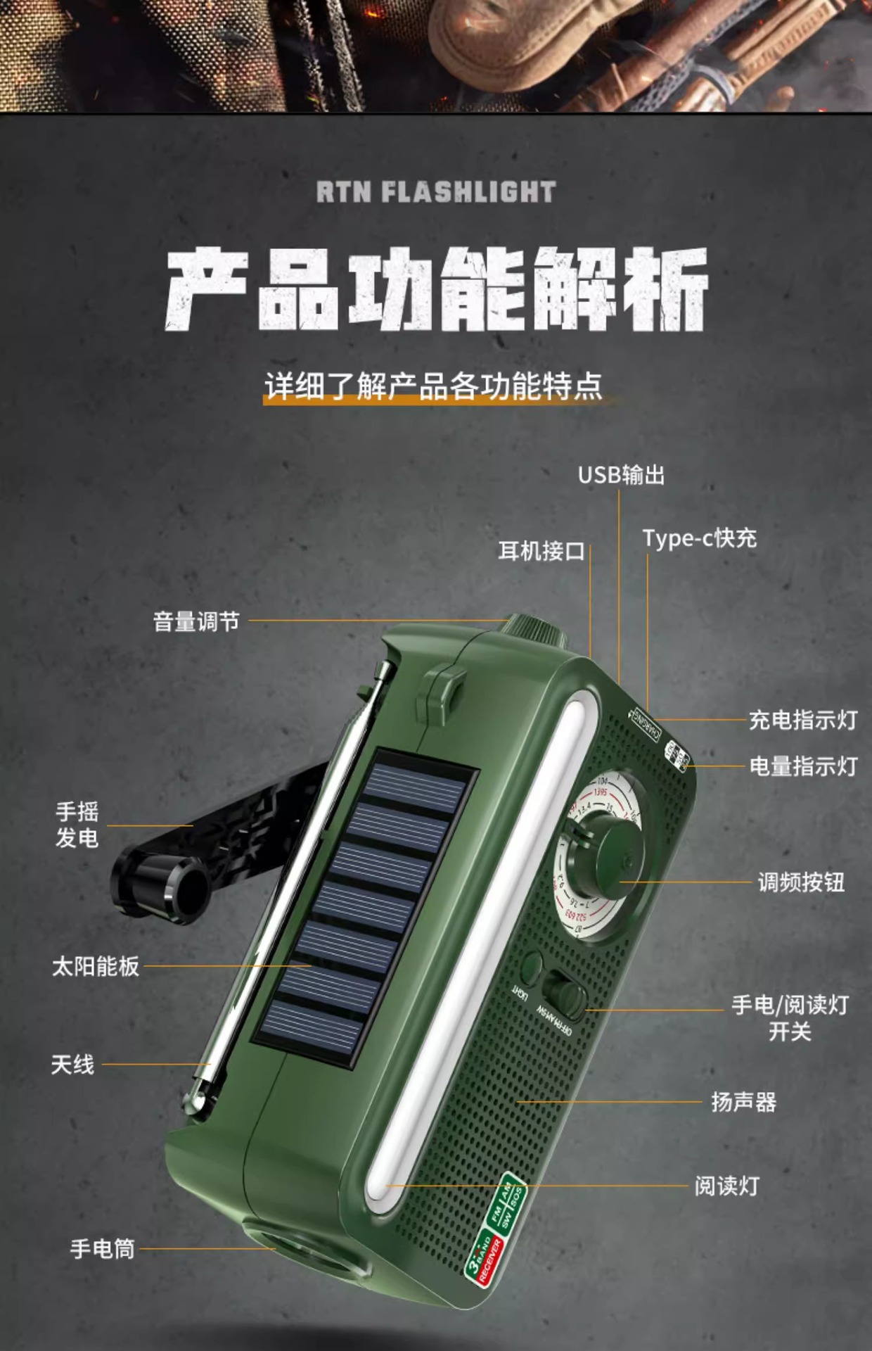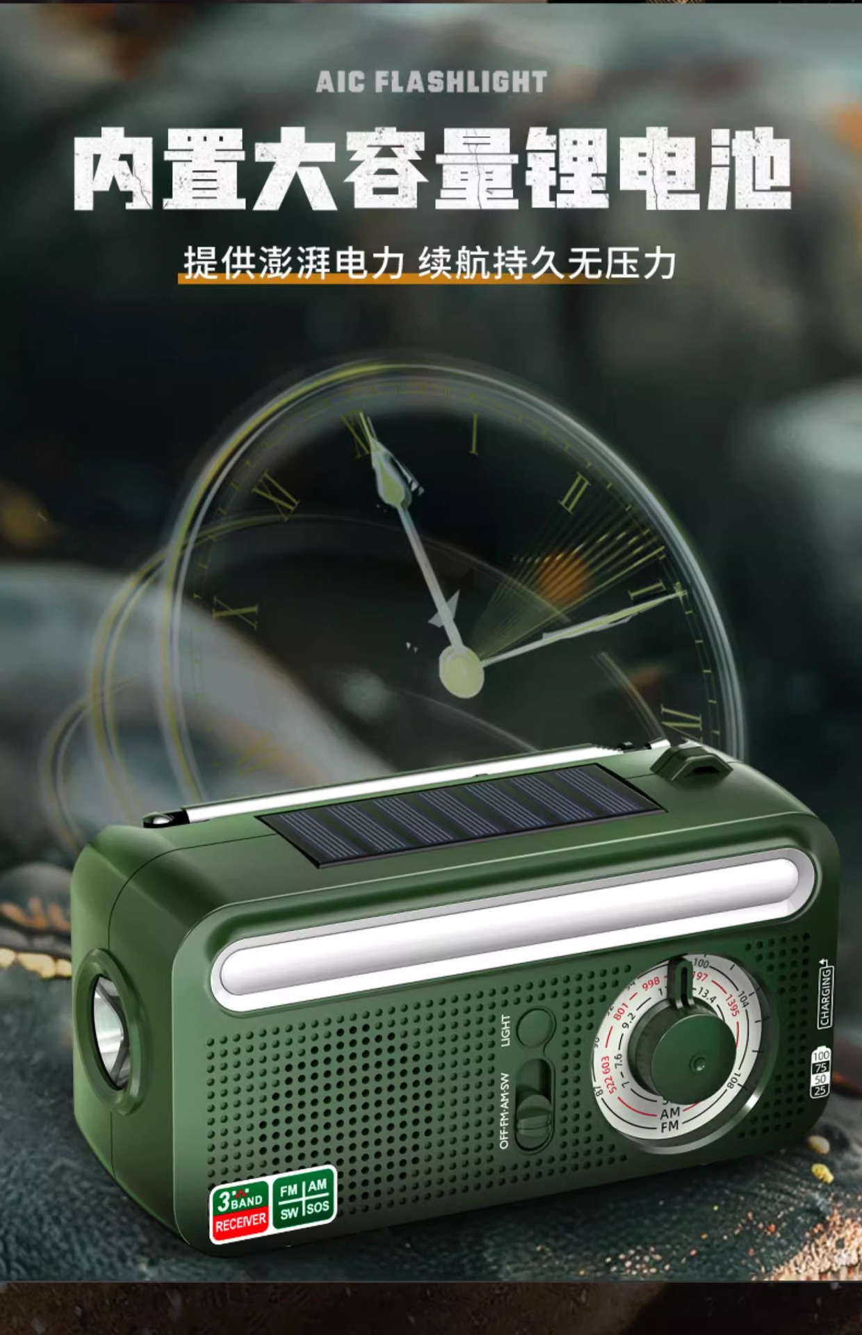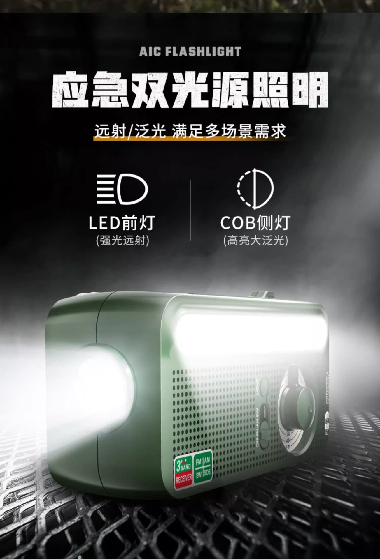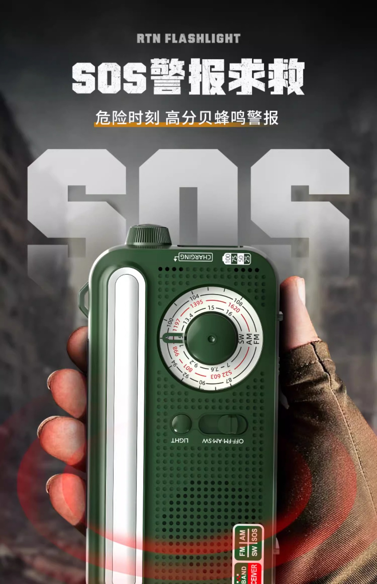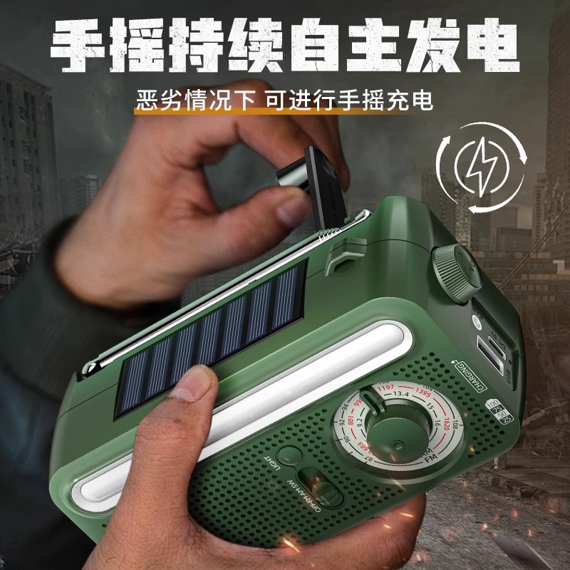 Radio + Solar charging + Hand-crank power generation + Dual light sources + SOS alarm. Standby for 1980 days.